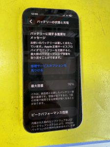 バッテリー最大容量がなんと76%と劣化警告をお知らせするサービスメッセージが出ていました。